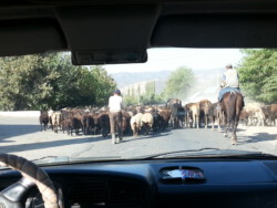 Unterwegs auf den Straßen sollte man es nicht eilig haben. Da kann es auch mal schnell vorkommen, dass die Weiterfahrt durch eine Viehherde blockiert wird. Dieses Land hat mich sofort in seinen Bann gezogen. Vor allem die atemberaubend schöne Landschaft und die herzliche Gastfreundschaft machen Kirgistan aus.